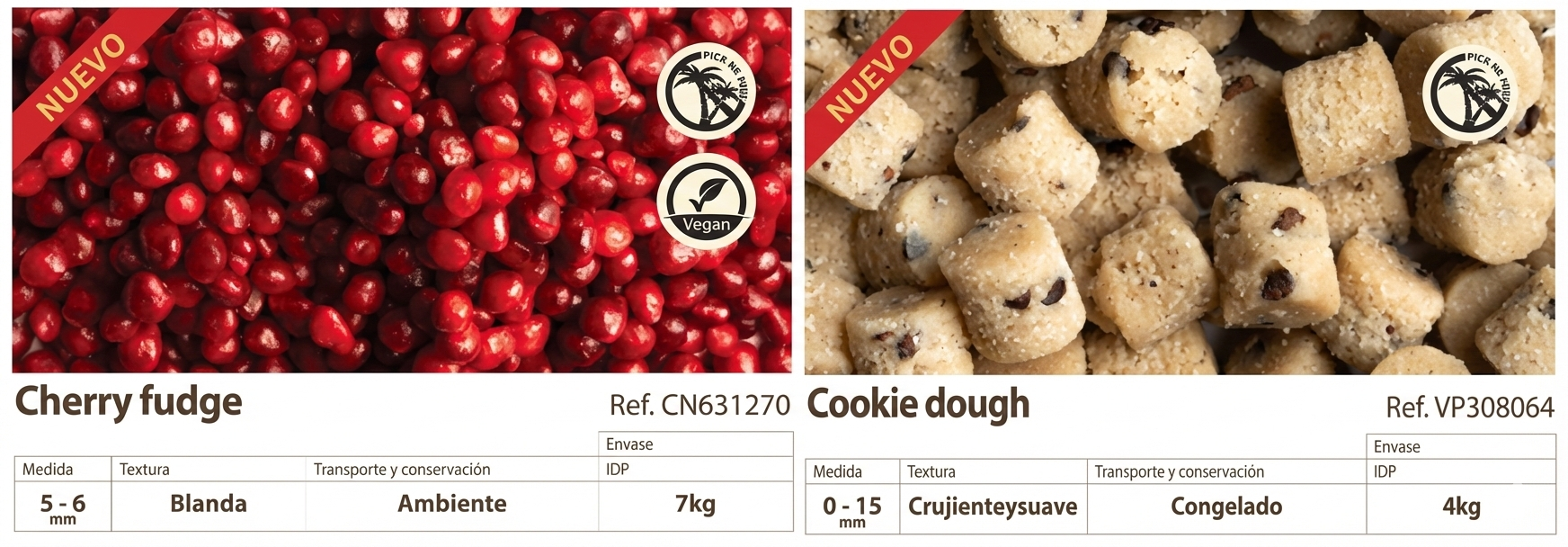 - ¡NUEVO! Cherry-Fudge – Vibrantes trozos de fudge rojo que aportan una textura suave y el intenso sabor afrutado de la cereza a tus creaciones.